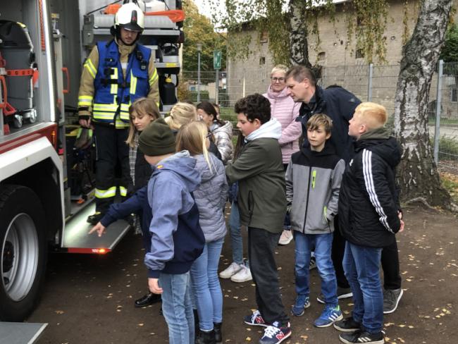 Der Rettungswagen wird erobert, im Inneren der Schule zeigen Feuerwehrmänner und -frauen ihre Ausrüstung und erzählen über ihre Arbeit. Kleine Experimente zum Thema Brandschutz werden durchgeführt.