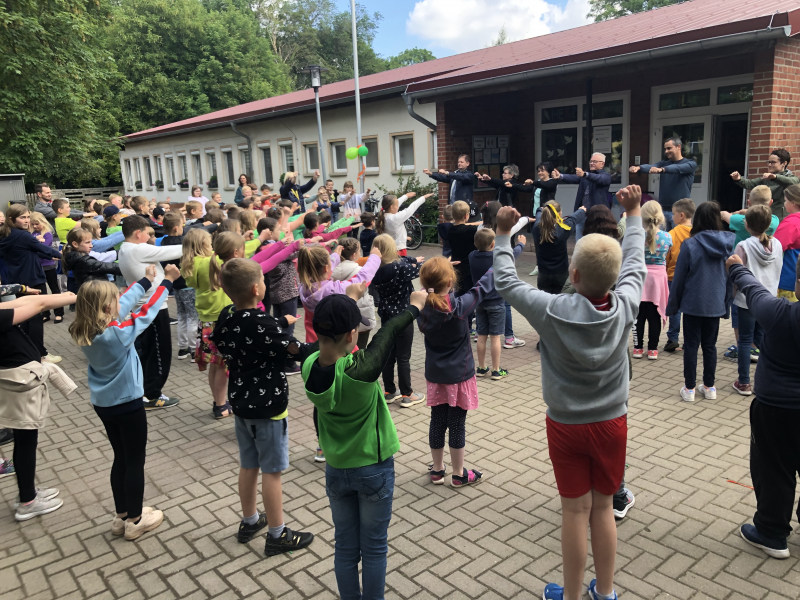 Neben zwei neuen Rollern für die Hof- und Spielpausen überraschten die Gäste die Schülerinnen und Schüler mit einem gemeinsamen Tanz, so dass die Stimmung richtig in Schwung kam.